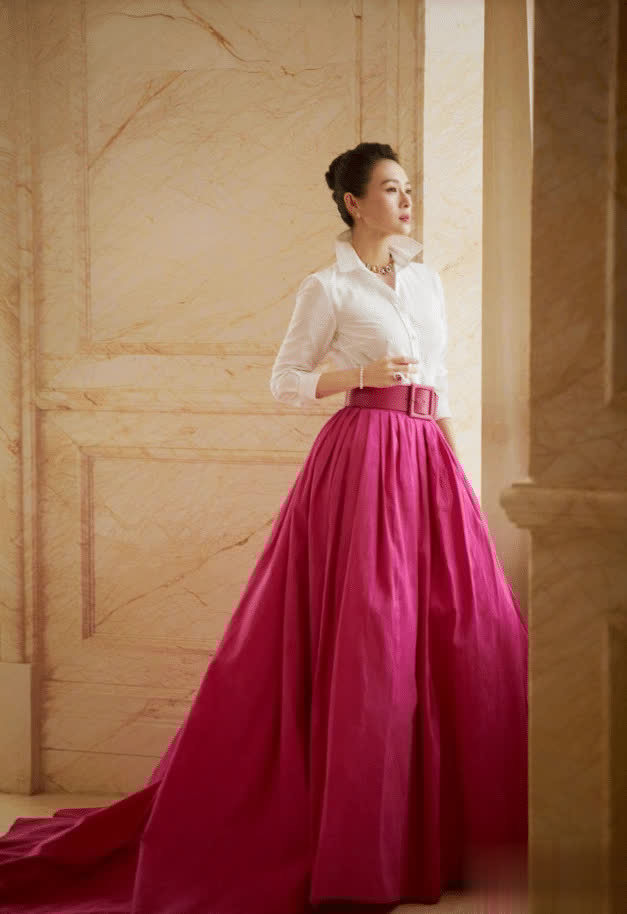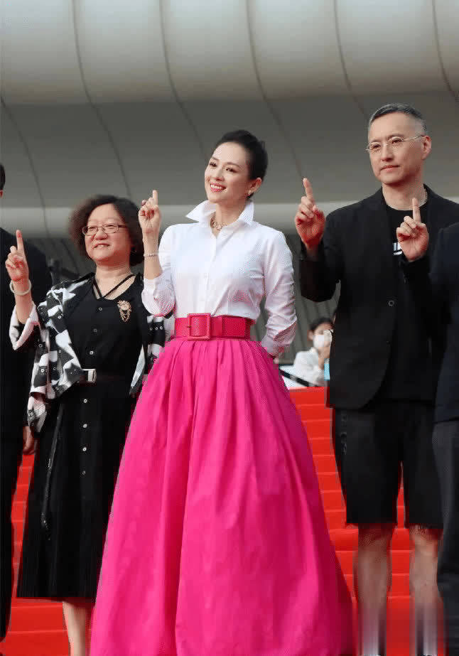 白色V领衬衫一直引领时尚潮流,适用于各种场合,无论是干净利落还是优雅大气,都能完美衬托出个人气质。为搭配下身裙子,章子怡将领子立起,增添了几分中性感。